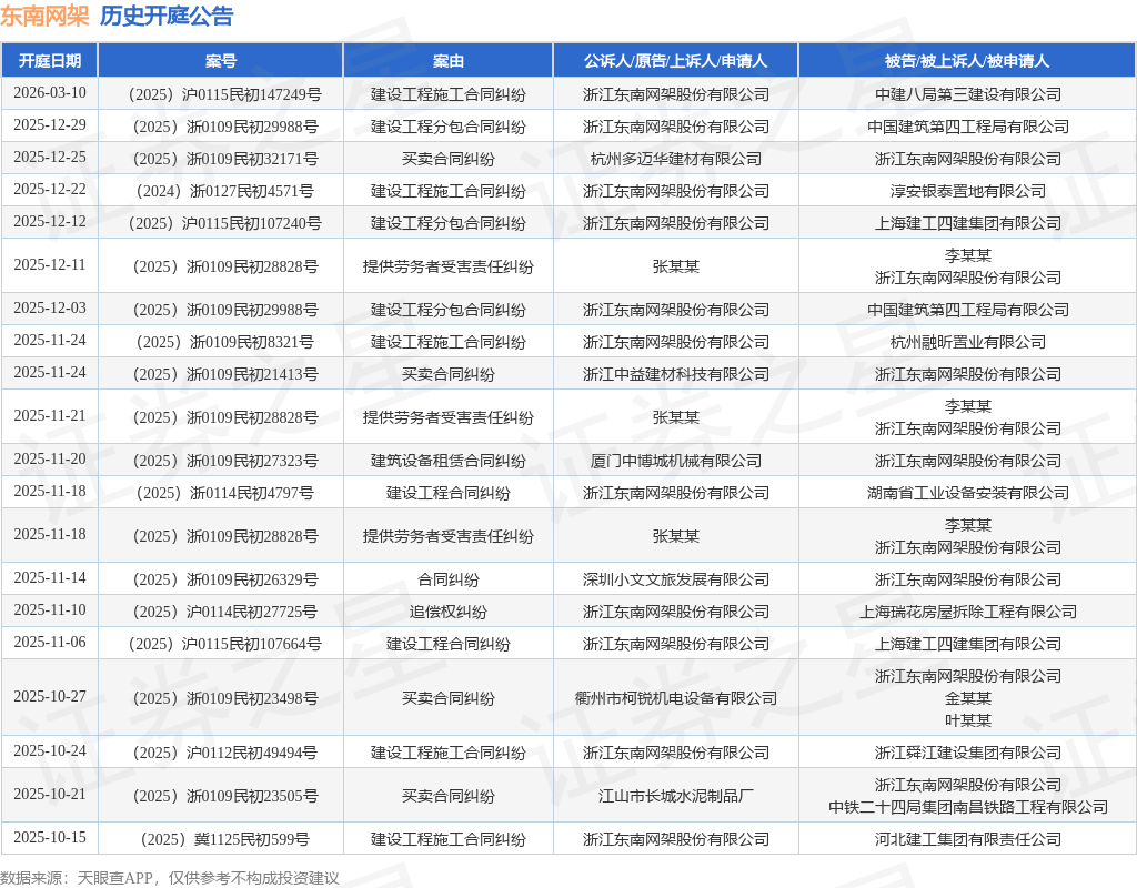 案号:(2025)浙0109民初32171号根据统计,近一年内以浙江东南网架股份有限公司为当事人的历史开庭公告有64则,其中案由为“建设工程施工合同纠纷”的公告以18则居首,其次为“买卖合同纠纷”有12则,“建设工程分包合同纠纷”有9则。历史开庭公告(前20条)如下:
