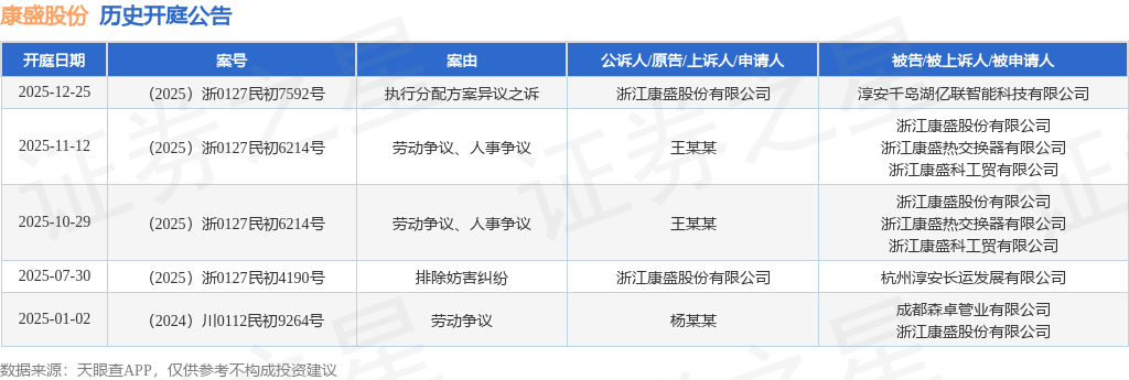 案号:(2025)浙0127民初7592号根据统计,近一年内以浙江康盛股份有限公司为当事人的历史开庭公告有5则,其中案由为“劳动争议、人事争议”的公告以2则居首,其次为“劳动争议”有1则,“执行分配方案异议之诉”有1则。历史开庭公告如下: