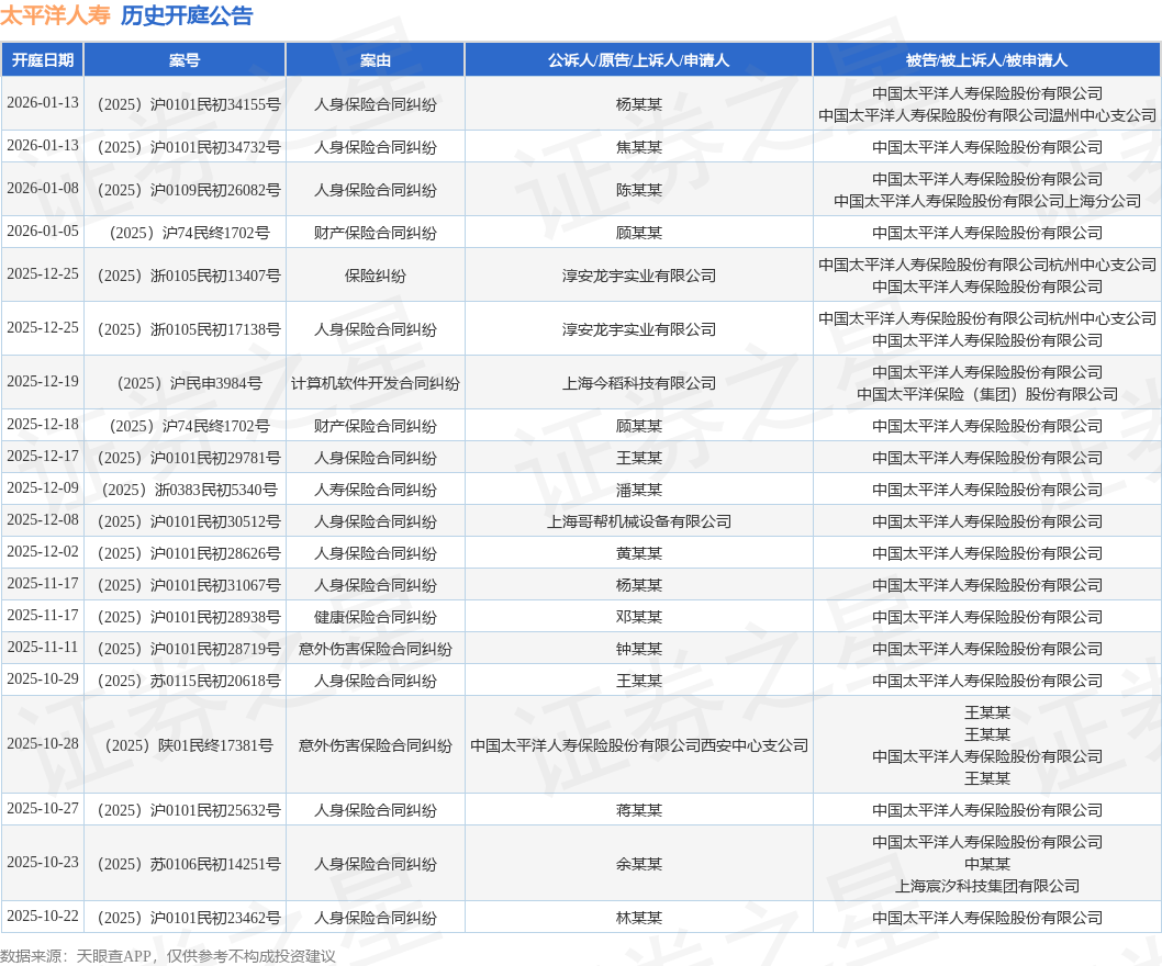 案号:(2025)浙0105民初13407号根据统计,近一年内以中国太平洋人寿保险股份有限公司为当事人的历史开庭公告有143则,其中案由为“人身保险合同纠纷”的公告以92则居首,其次为“意外伤害保险合同纠纷”有14则,“保险纠纷”有12则。历史开庭公告(前20条)如下: