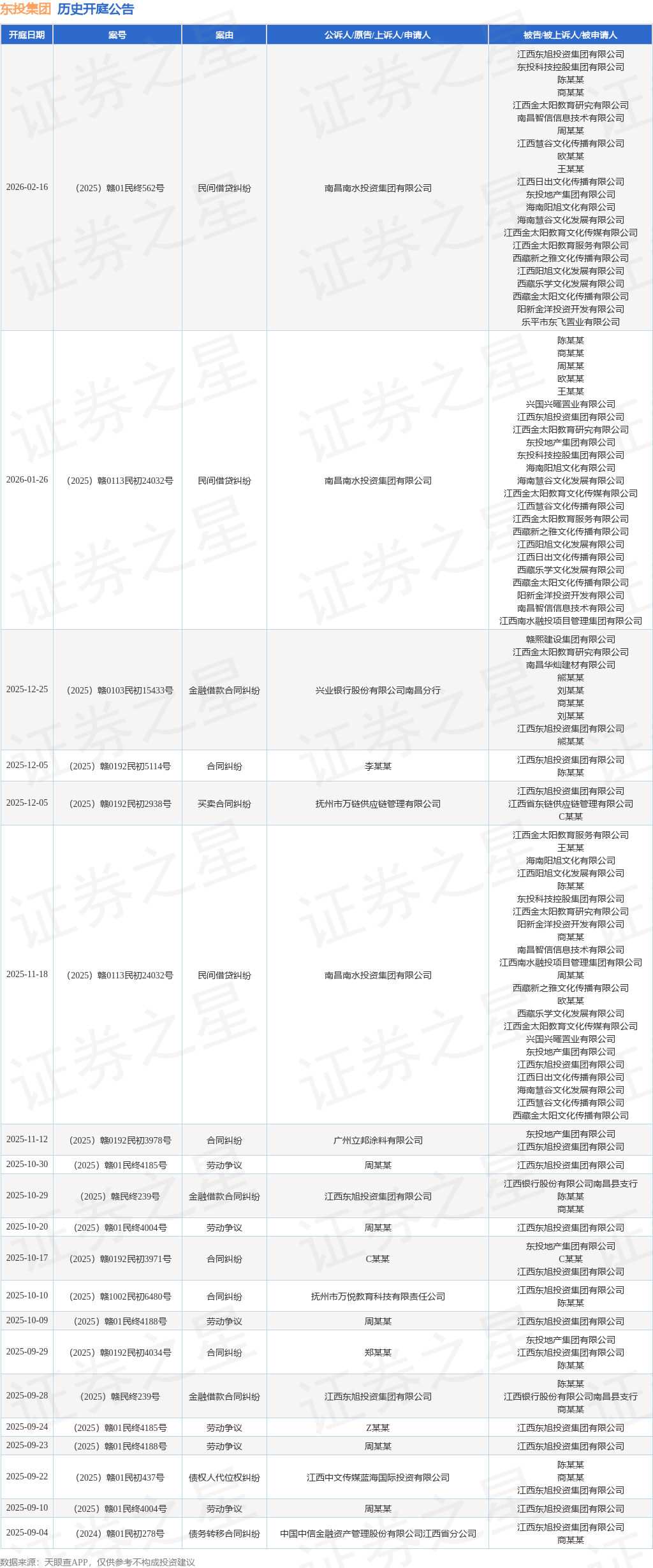 案号:(2025)赣0103民初15433号根据统计,近一年内以江西东旭投资集团有限公司为当事人的历史开庭公告有54则,其中案由为“合同纠纷”的公告以19则居首,其次为“劳动争议”有11则,“追偿权纠纷”有5则。历史开庭公告(前20条)如下: