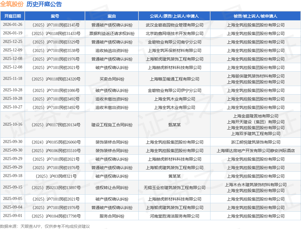 案号:(2025)沪7101民初3329号根据统计,近一年内以上海全筑控股集团股份有限公司为当事人的历史开庭公告有85则,其中案由为“破产债权确认纠纷”的公告以19则居首,其次为“装饰装修合同纠纷”有14则,“建设工程施工合同纠纷”有13则。历史开庭公告(前20条)如下: