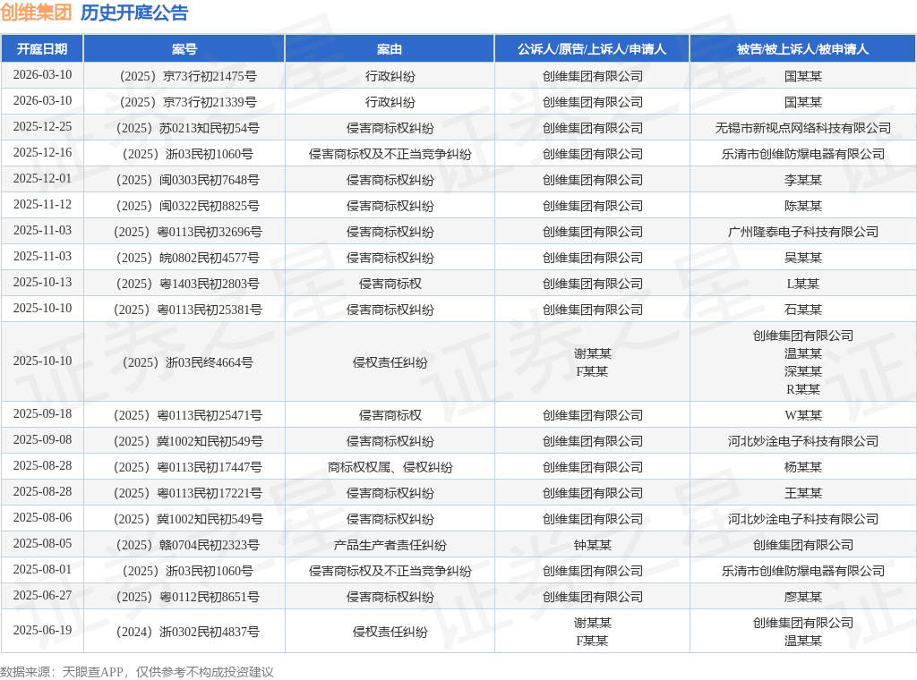案号:(2025)苏0213知民初54号根据统计,近一年内以创维集团有限公司为当事人的历史开庭公告有48则,其中案由为“侵害商标权纠纷”的公告以33则居首,其次为“商标权权属、侵权纠纷”有4则,“侵害商标权”有2则。历史开庭公告(前20条)如下: