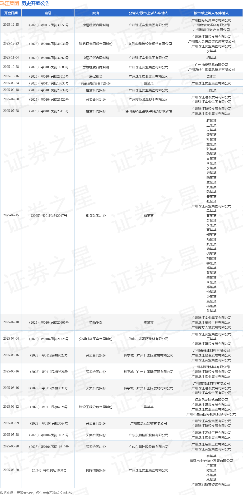 案号:(2025)粤0112民初30550号根据统计,近一年内以广州珠江实业集团有限公司为当事人的历史开庭公告有48则,其中案由为“买卖合同纠纷”的公告以18则居首,其次为“民间借贷纠纷”有10则,“建筑设备租赁合同纠纷”有3则。历史开庭公告(前20条)如下: