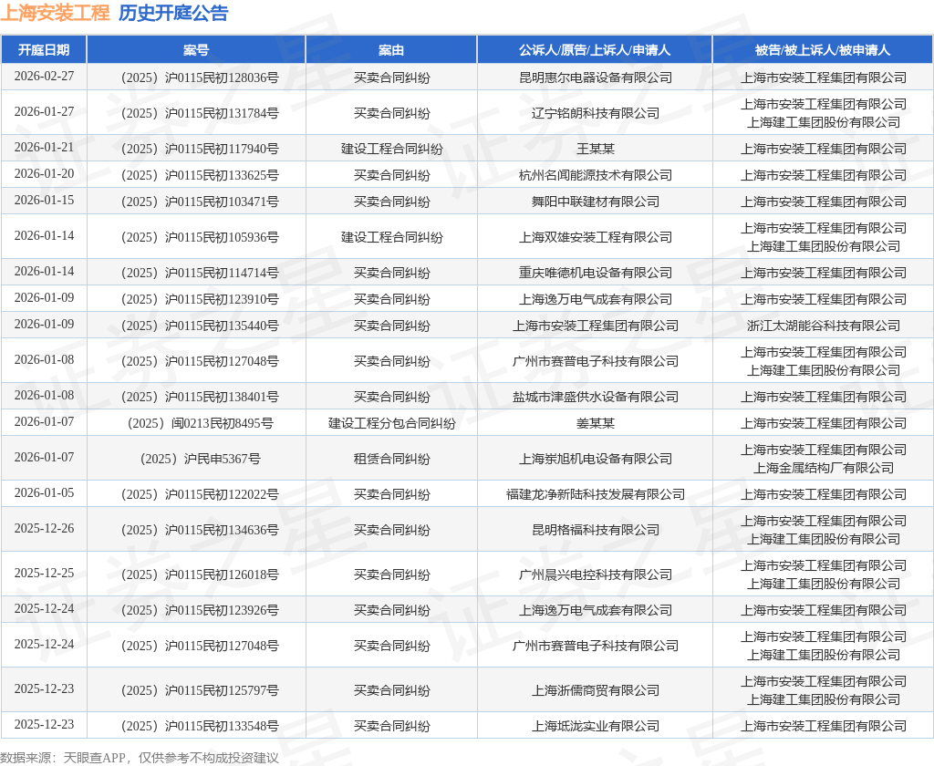 案号:(2025)沪0115民初126018号根据统计,近一年内以上海市安装工程集团有限公司为当事人的历史开庭公告有191则,其中案由为“买卖合同纠纷”的公告以117则居首,其次为“建设工程施工合同纠纷”有25则,“建设工程分包合同纠纷”有10则。历史开庭公告(前20条)如下: