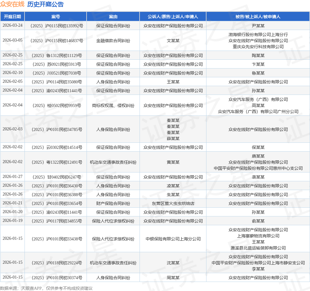 案号:(2025)沪0101民初32299号根据统计,近一年内以众安在线财产保险股份有限公司为当事人的历史开庭公告有4565则,其中案由为“保证保险合同纠纷”的公告以2973则居首,其次为“人身保险合同纠纷”有616则,“保险人代位求偿权纠纷”有290则。历史开庭公告(前20条)如下: