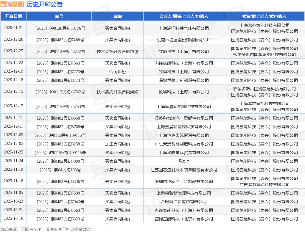 案号:(2025)沪0112民初46742号根据统计,近一年内以国鸿氢能科技(嘉兴)股份有限公司为当事人的历史开庭公告有41则,其中案由为“买卖合同纠纷”的公告以34则居首,其次为“劳动争议”有2则,“技术委托开发合同纠纷”有2则。历史开庭公告(前20条)如下: