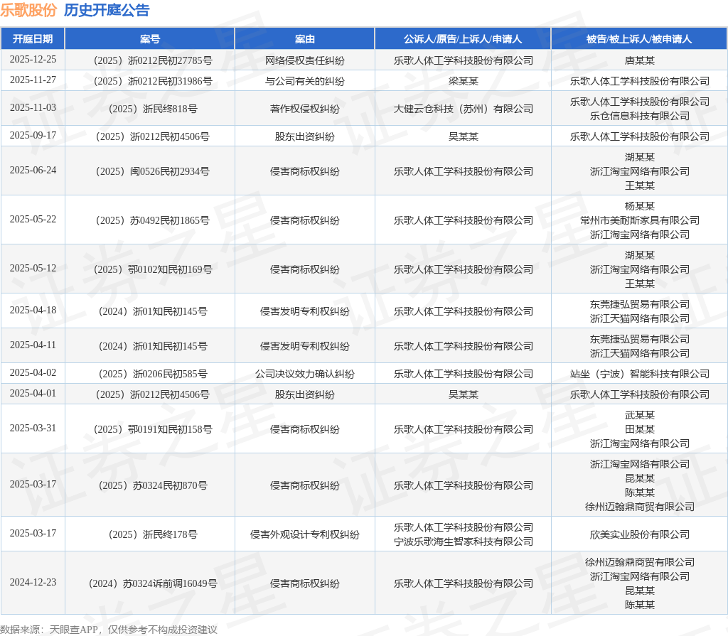 案号:(2025)浙0212民初27785号根据统计,近一年内以乐歌人体工学科技股份有限公司为当事人的历史开庭公告有15则,其中案由为“侵害商标权纠纷”的公告以6则居首,其次为“侵害发明专利权纠纷”有2则,“股东出资纠纷”有2则。历史开庭公告如下: