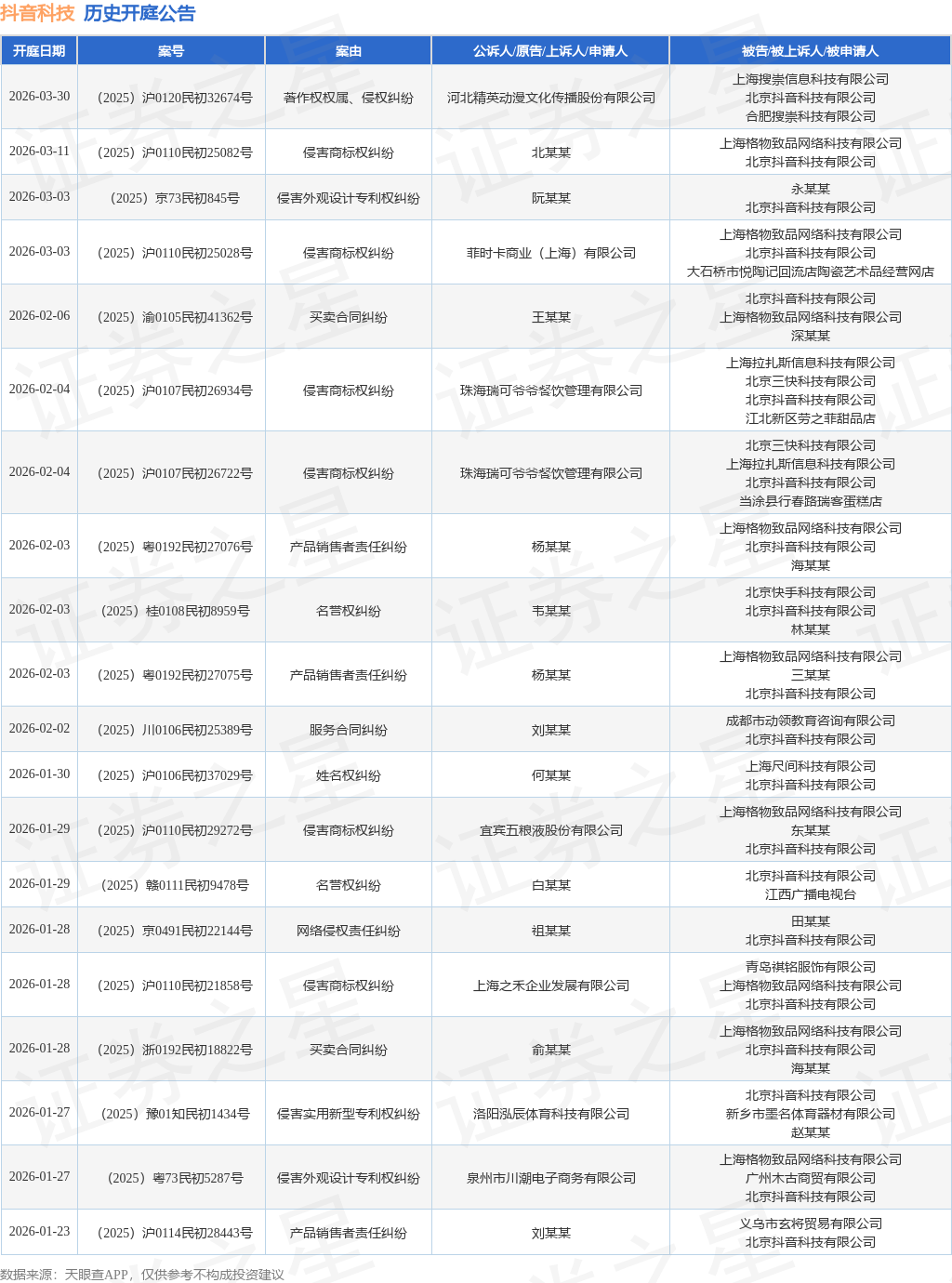 案号:(2025)浙0603民初17978号根据统计,近一年内以北京抖音科技有限公司为当事人的历史开庭公告有1569则,其中案由为“侵害外观设计专利权纠纷”的公告以199则居首,其次为“侵害商标权纠纷”有175则,“名誉权纠纷”有156则。历史开庭公告(前20条)如下: