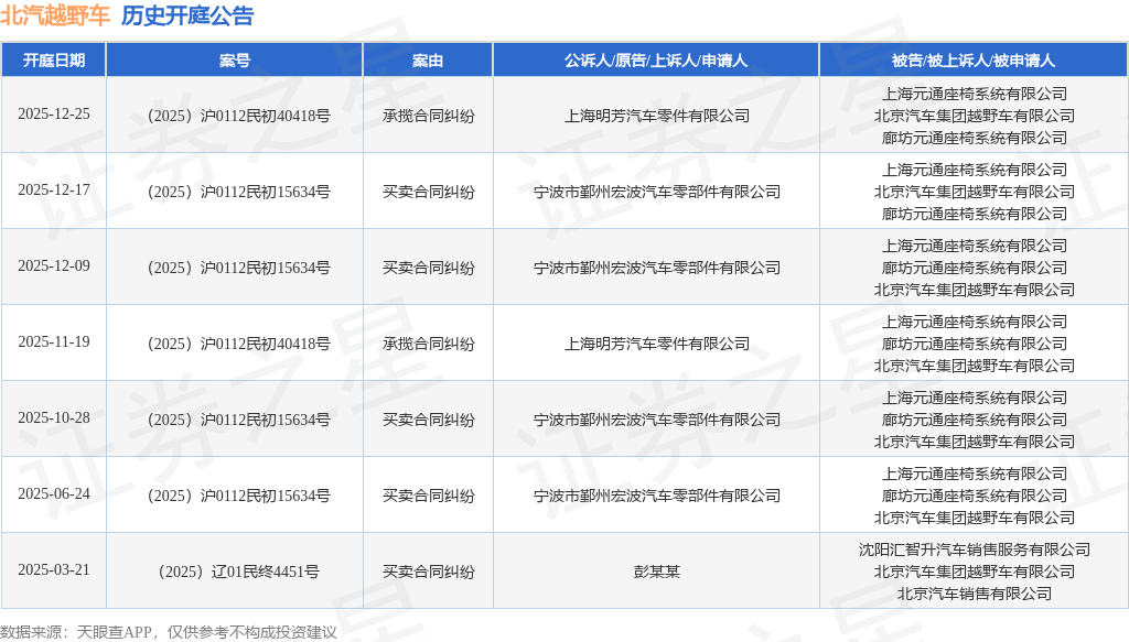 根据统计,近一年内以北京汽车集团越野车有限公司为当事人的历史开庭公告有7则,其中案由为“买卖合同纠纷”的公告以5则居首,其次为“承揽合同纠纷”有2则。历史开庭公告如下: