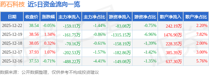 证券之星消息,截至2025年12月22日收盘,药石科技(300725)报收于38.54元,下跌0.05%,换手率1.41%,成交量2.86万手,成交额1.1亿元。
