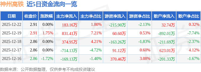 证券之星消息,截至2025年12月22日收盘,神州高铁(000008)报收于2.91元,上涨0.0%,换手率1.28%,成交量34.8万手,成交额1.01亿元。