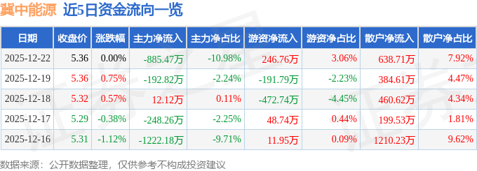 证券之星消息,截至2025年12月22日收盘,冀中能源(000937)报收于5.36元,上涨0.0%,换手率0.44%,成交量15.02万手,成交额8066.38万元。