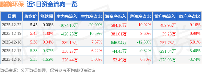 证券之星消息,截至2025年12月22日收盘,鹏鹞环保(300664)报收于5.45元,上涨0.0%,换手率1.3%,成交量9.79万手,成交额5347.72万元。