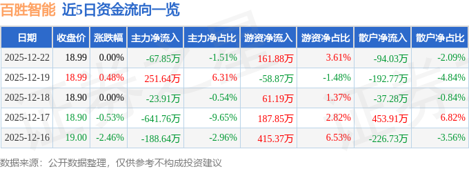 证券之星消息,截至2025年12月22日收盘,百胜智能(301083)报收于18.99元,上涨0.0%,换手率2.75%,成交量2.36万手,成交额4488.39万元。