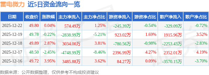 证券之星消息,截至2025年12月22日收盘,雷电微力(301050)报收于49.8元,上涨0.04%,换手率4.37%,成交量9.19万手,成交额4.58亿元。