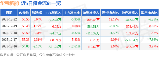 证券之星消息,截至2025年12月22日收盘,华宝新能(301327)报收于56.5元,上涨0.04%,换手率1.53%,成交量1.17万手,成交额6605.63万元。