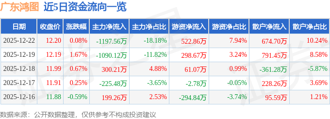 12月22日的资金流向数据方面,主力资金净流出1197.56万元,占总成交额18.18%,游资资金净流入522.86万元,占总成交额7.94%,散户资金净流入674.7万元,占总成交额10.24%。