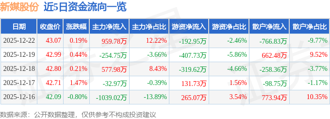 证券之星消息,截至2025年12月22日收盘,新媒股份(300770)报收于43.07元,上涨0.19%,换手率0.8%,成交量1.82万手,成交额7851.54万元。