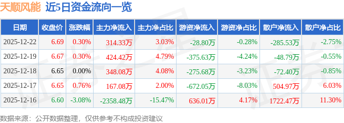 证券之星消息,截至2025年12月22日收盘,天顺风能(002531)报收于6.69元,上涨0.3%,换手率0.87%,成交量15.47万手,成交额1.04亿元。