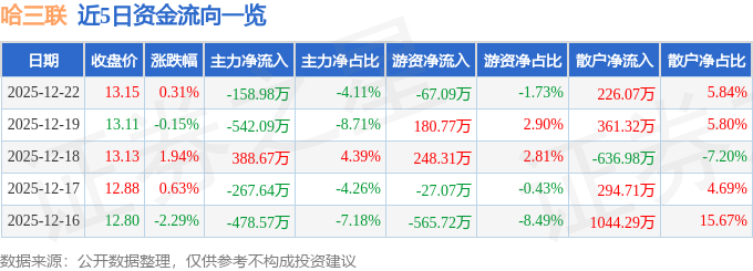 证券之星消息,截至2025年12月22日收盘,哈三联(002900)报收于13.15元,上涨0.31%,换手率1.69%,成交量2.96万手,成交额3870.11万元。