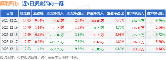 证券之星消息,截至2025年12月22日收盘,隆利科技(300752)报收于17.85元,上涨0.34%,换手率1.63%,成交量2.57万手,成交额4592.93万元。