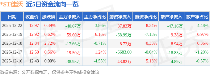 证券之星消息,截至2025年12月22日收盘,*ST佳沃(300268)报收于12.97元,上涨0.39%,换手率0.61%,成交量8136.0手,成交额1052.94万元。