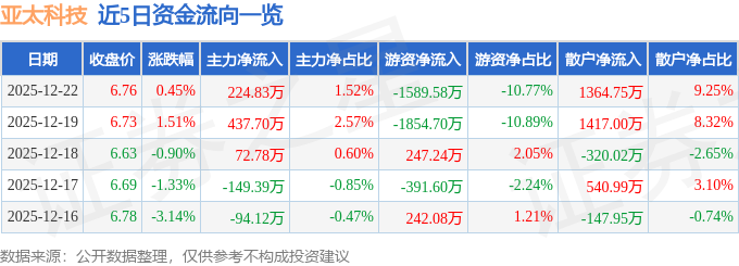 证券之星消息,截至2025年12月22日收盘,亚太科技(002540)报收于6.76元,上涨0.45%,换手率2.49%,成交量21.69万手,成交额1.48亿元。
