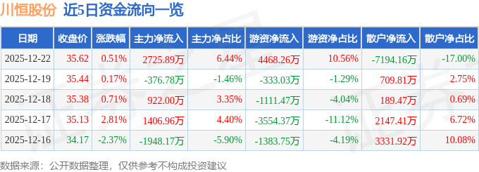 证券之星消息,截至2025年12月22日收盘,川恒股份(002895)报收于35.62元,上涨0.51%,换手率2.0%,成交量11.93万手,成交额4.23亿元。