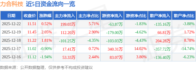 证券之星消息,截至2025年12月22日收盘,力合科技(300800)报收于11.51元,上涨0.52%,换手率1.29%,成交量3.02万手,成交额3486.04万元。