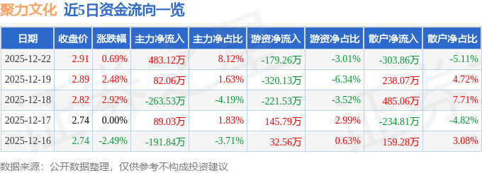 证券之星消息,截至2025年12月22日收盘,聚力文化(002247)报收于2.91元,上涨0.69%,换手率3.17%,成交量20.41万手,成交额5948.43万元。