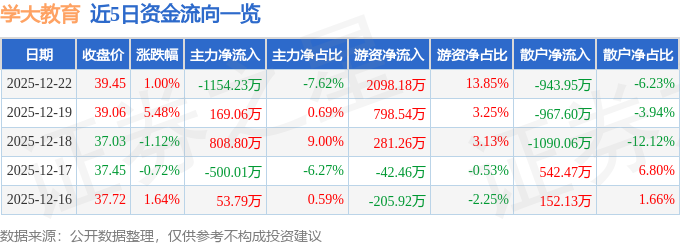 证券之星消息,截至2025年12月22日收盘,学大教育(000526)报收于39.45元,上涨1.0%,换手率3.23%,成交量3.85万手,成交额1.51亿元。