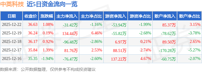 证券之星消息,截至2025年12月22日收盘,中英科技(300936)报收于36.63元,上涨1.08%,换手率1.55%,成交量7359.0手,成交额2706.02万元。