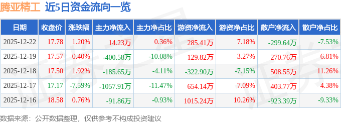 证券之星消息,截至2025年12月22日收盘,腾亚精工(301125)报收于17.78元,上涨1.2%,换手率1.92%,成交量2.26万手,成交额3977.73万元。