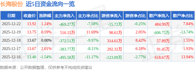 证券之星消息,截至2025年12月22日收盘,长海股份(300196)报收于13.92元,上涨1.24%,换手率1.81%,成交量4.46万手,成交额6189.22万元。