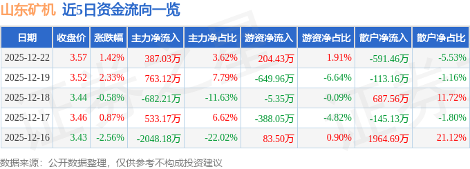 证券之星消息,截至2025年12月22日收盘,山东矿机(002526)报收于3.57元,上涨1.42%,换手率1.69%,成交量29.86万手,成交额1.07亿元。