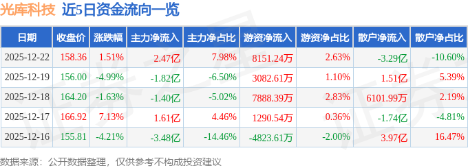 证券之星消息,截至2025年12月22日收盘,光库科技(300620)报收于158.36元,上涨1.51%,换手率7.91%,成交量19.55万手,成交额31.02亿元。
