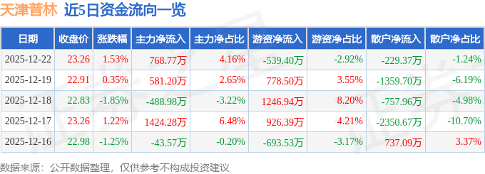 证券之星消息,截至2025年12月22日收盘,天津普林(002134)报收于23.26元,上涨1.53%,换手率3.23%,成交量7.94万手,成交额1.85亿元。