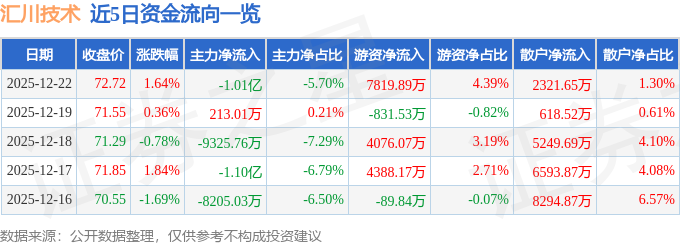 证券之星消息,截至2025年12月22日收盘,汇川技术(300124)报收于72.72元,上涨1.64%,换手率1.03%,成交量24.47万手,成交额17.8亿元。