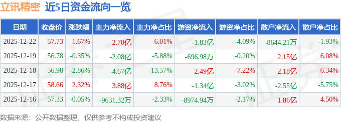 证券之星消息,截至2025年12月22日收盘,立讯精密(002475)报收于57.73元,上涨1.67%,换手率1.07%,成交量77.73万手,成交额44.86亿元。