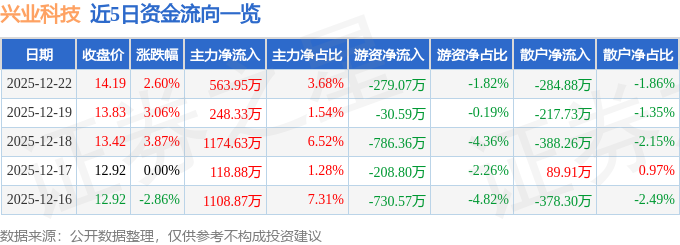 证券之星消息,截至2025年12月22日收盘,兴业科技(002674)报收于14.19元,上涨2.6%,换手率3.71%,成交量10.84万手,成交额1.53亿元。