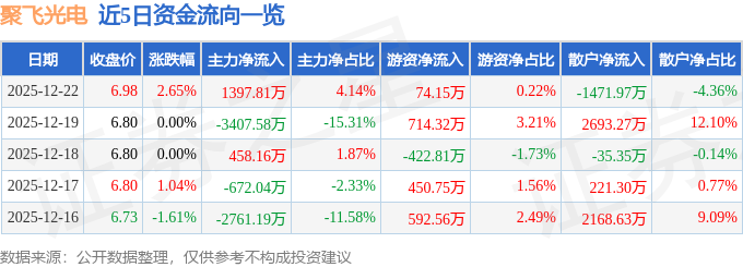 证券之星消息,截至2025年12月22日收盘,聚飞光电(300303)报收于6.98元,上涨2.65%,换手率3.65%,成交量48.42万手,成交额3.38亿元。