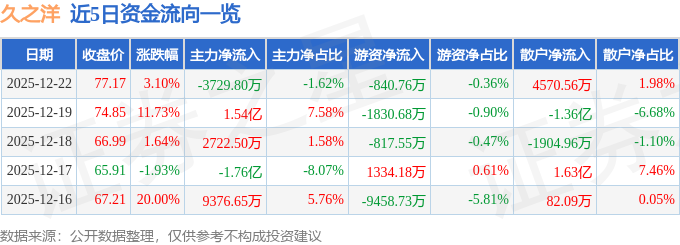 证券之星消息,截至2025年12月22日收盘,久之洋(300516)报收于77.17元,上涨3.1%,换手率16.25%,成交量29.25万手,成交额23.04亿元。
