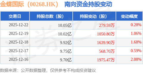 证券之星消息,12月22日南向资金增持279.59万股金蝶国际(00268.HK)。近5个交易日中,获南向资金增持的有5天,累计净增持5514.47万股。近20个交易日中,获南向资金增持的有8天,累计净增持2616.55万股。截至目前,南向资金持有金蝶国际(00268.HK)10.05亿股,占公司已发行普通股的28.3%。