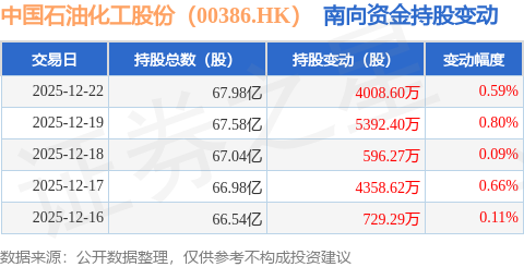 证券之星消息,12月22日南向资金增持4008.6万股中国石油化工股份(00386.HK)。近5个交易日中,获南向资金增持的有5天,累计净增持1.51亿股。近20个交易日中,获南向资金增持的有13天,累计净增持1.9亿股。截至目前,南向资金持有中国石油化工股份(00386.HK)67.98亿股,占公司已发行普通股的28.38%。