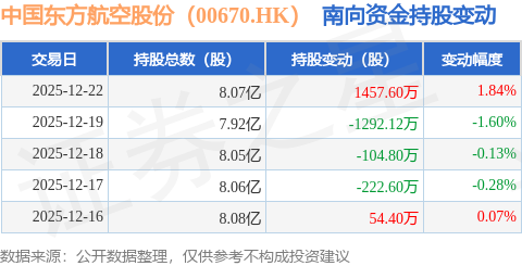 证券之星消息,12月22日南向资金增持1457.6万股中国东方航空股份(00670.HK)。近5个交易日中,获南向资金减持的有3天,累计净减持107.52万股。近20个交易日中,获南向资金增持的有11天,累计净增持1777.68万股。截至目前,南向资金持有中国东方航空股份(00670.HK)8.07亿股,占公司已发行普通股的15.93%。