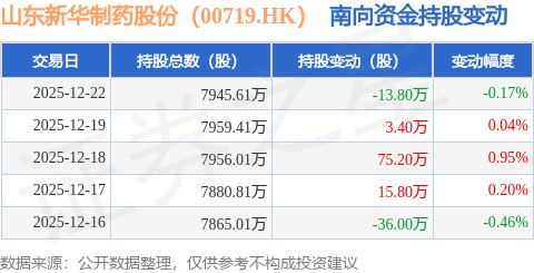 证券之星消息,12月22日南向资金减持13.8万股山东新华制药股份(00719.HK)。近5个交易日中,获南向资金增持的有3天,累计净增持44.6万股。近20个交易日中,获南向资金增持的有8天,累计净增持50.8万股。截至目前,南向资金持有山东新华制药股份(00719.HK)7945.61万股,占公司已发行普通股的40.74%。