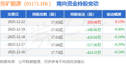 证券之星消息,12月22日南向资金增持269.98万股兖矿能源(01171.HK)。近5个交易日中,获南向资金减持的有4天,累计净减持1200.9万股。近20个交易日中,获南向资金减持的有14天,累计净减持3549.24万股。截至目前,南向资金持有兖矿能源(01171.HK)17.65亿股,占公司已发行普通股的43.3%。