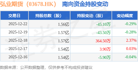 证券之星消息,12月22日南向资金减持45.1万股弘业期货(03678.HK)。近5个交易日中,获南向资金增持的有2天,累计净增持273.9万股。近20个交易日中,获南向资金增持的有7天,累计净增持227.8万股。截至目前,南向资金持有弘业期货(03678.HK)1.56亿股,占公司已发行普通股的62.58%。