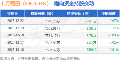 证券之星消息,12月22日南向资金减持5.61万股十月稻田(09676.HK)。近5个交易日中,获南向资金减持的有5天,累计净减持24.09万股。近20个交易日中,获南向资金减持的有20天,累计净减持99.24万股。截至目前,南向资金持有十月稻田(09676.HK)7546.2万股,占公司已发行普通股的7.05%。