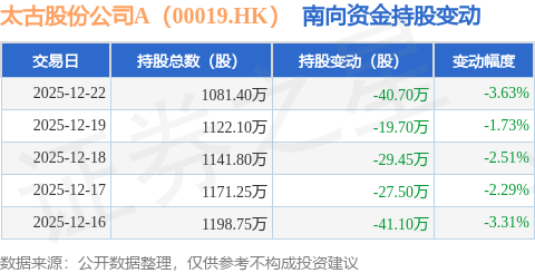 证券之星消息,12月22日南向资金减持40.7万股太古股份公司A(00019.HK)。近5个交易日中,获南向资金减持的有5天,累计净减持158.45万股。近20个交易日中,获南向资金减持的有13天,累计净减持214.33万股。截至目前,南向资金持有太古股份公司A(00019.HK)1081.4万股,占公司已发行普通股的1.38%。